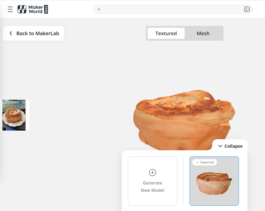 This particular bun was unique, though buns in general aren’t rare. The “Image to 3D” had no problem to generate the model. It took just a couple of minutes and cost me 2 AI credits in Makers World.