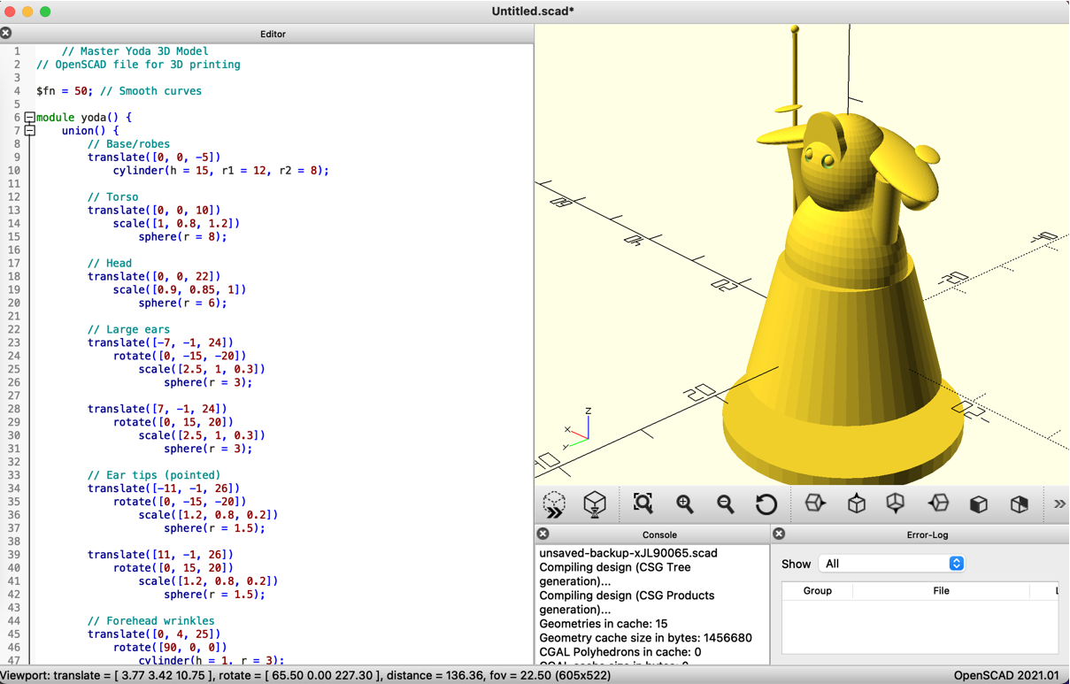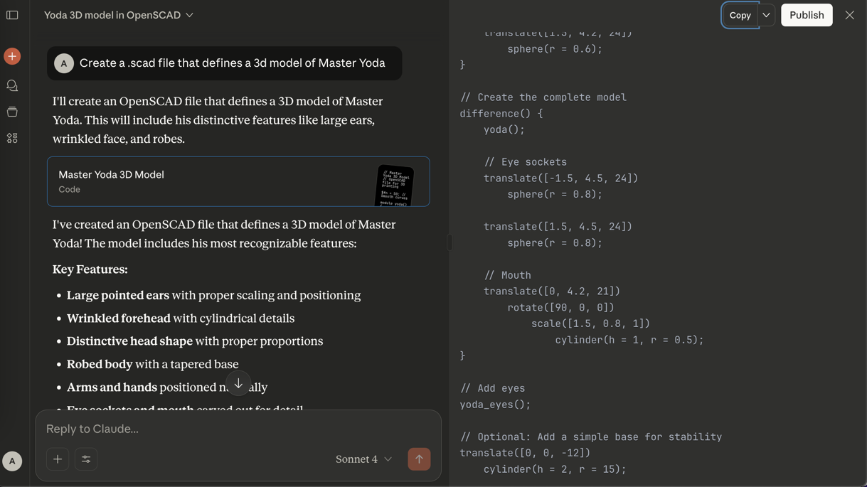 I tried using Claude to generate OpenSCAD code. It worked reasonably well—fast and syntactically correct, though not perfect. One issue: the Yoda model “hangs” on a plate. While it works as a 3D model, it’s impractical for printing as a single piece—even with supports.
