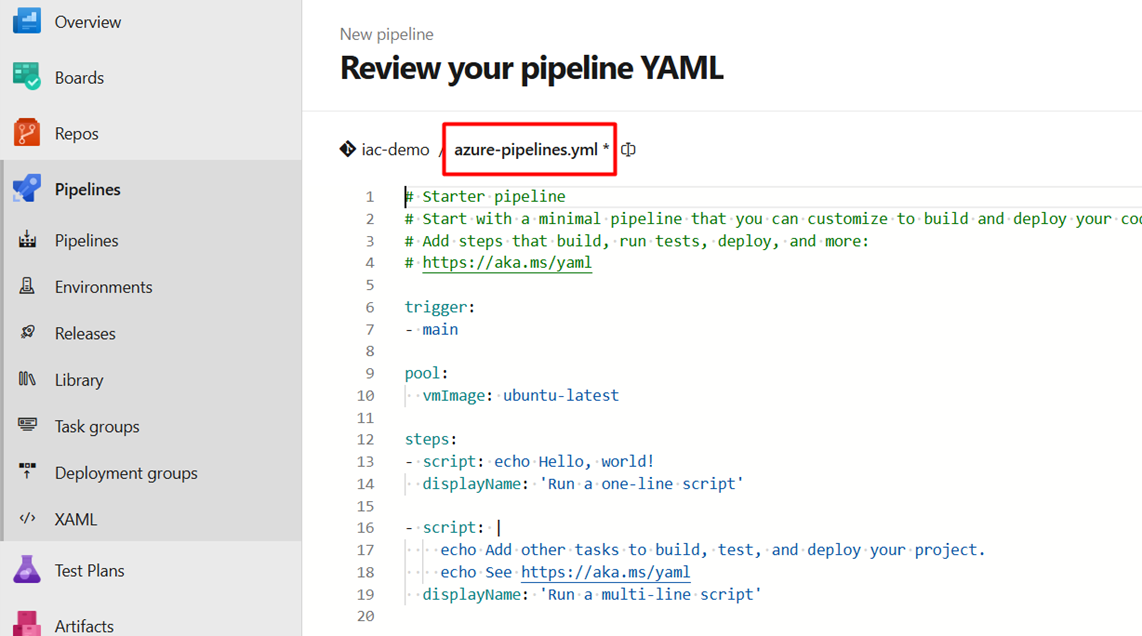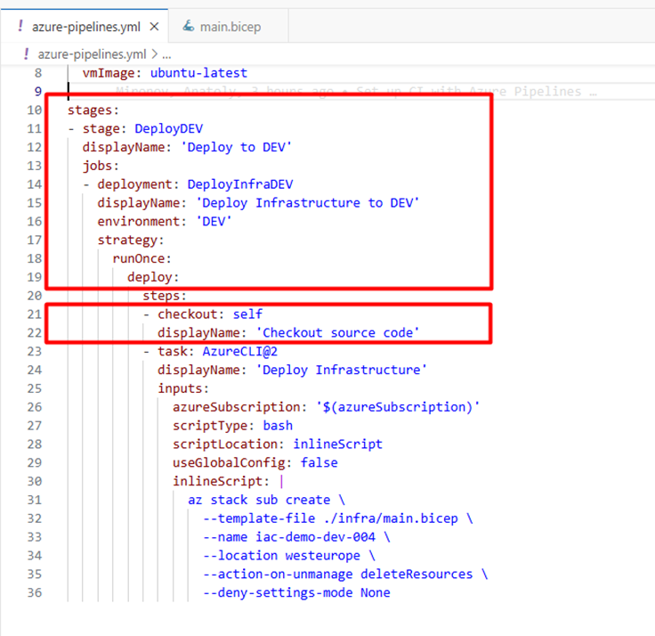 Now update your azure-pipelines.yml to deploy this Bicep file using Azure CLI: